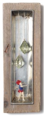 Diese zu definieren dürfte mir jedoch nicht all zu leicht fallen, wenngleich sich möglicherweise so etwas wie eine Leitlinie erkennen lässt. Eine Konstante, ein Fixpunkt ist sicherlich die Vorliebe für Gegenstände mit einer gewissen "Patina". Nur wenige Teile in meiner großen Materialsammlung sind jünger als 45, 50 Jahre*). Eine Vorliebe für Szenerien mit Figuren (meist aus Kunststoff) verraten meine Objekte selbst. Holz als Träger, Plattform, Gehäuse oder Behausung spielt ebenfalls eine kaum zu übersehende große Rolle - wobei auch hier, von ganz wenigen Ausnahmen abgesehen, kein neues Material aus der Holzabteilung des Baumarkts zum Einsatz kommt sondern Schwemmholz von Stränden, Möbelreste vom Sperrmüll, Kisterl usw. vom Flohmarkt.